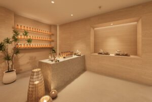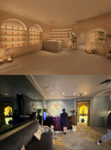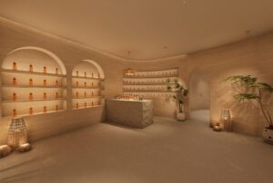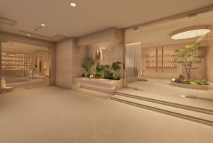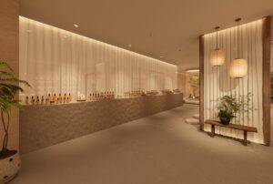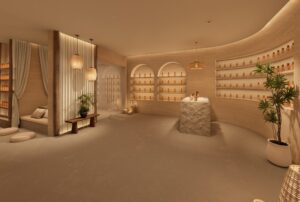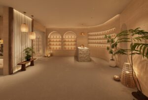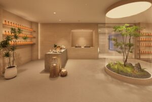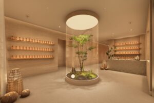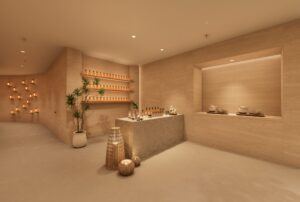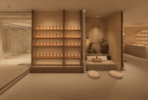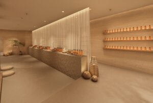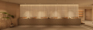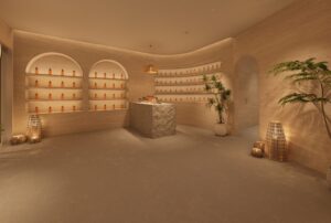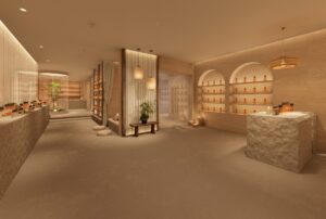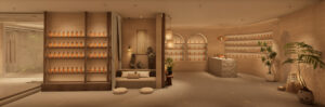 With “imperfect beauty” as the core, it emphasizes the texture of natural materials, the traces of time, and the tranquility of space. The fragrance display area is ingeniously woven into the spatial texture – a cave stone wall is recessed inward, forming a natural niche.