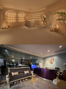 The central hall uses a fragrance mixing table and shelves to display products. There is a white hanging curtain above the left fragrance table, adding a soft and layered feeling to the space; Install multiple shelves on the right wall, neatly arrange products, and add warm colored lighting to create a comfortable and relaxing atmosphere.