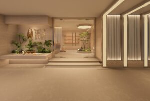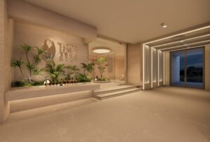 There is a brand logo on the left wall of the entrance hall, and a suspended platform below displays green plants and products, showcasing the brand image and adding a natural atmosphere.