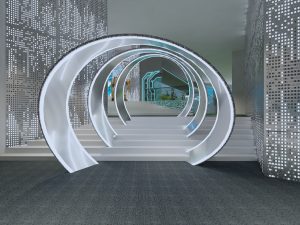 The ‘Time Tunnel Gate’ art installation is a highlight of the corridor area. Entering from the VIPA outer corridor through a passage, the view at the end of the passage suddenly becomes clear, achieving a visual feast and creating a sense of winding paths and a futuristic atmosphere. Choose avant-garde materials such as metal, glass, and linear lights. The corridor walls are made of stainless steel perforated panels, which are then polished with acrylic. At the same time, the holes of the luminous body are dense and sparse, gradually decreasing from the wall to the top, visually changing from calm to light and lively, with a sense of sci-fi transformation. The function of lighting is to navigate through the architectural space and showcase the unique visual texture of the building.