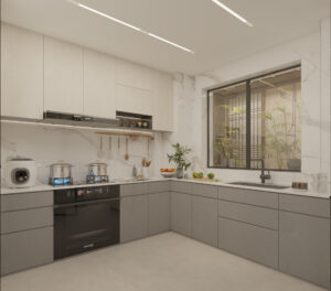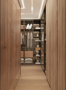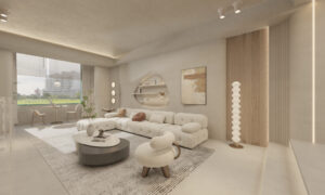 In the living room, the designer puts in gray and wooden decorative lamination as the main trend, and linen furniture to add on a sense of harmony.
