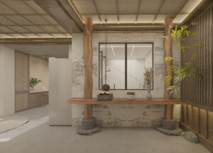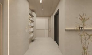 The entry area with simple design paired with warm colors also matches the wabi-sabi style.