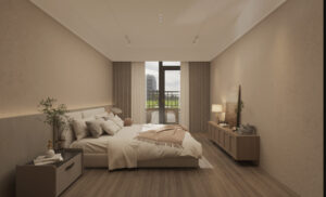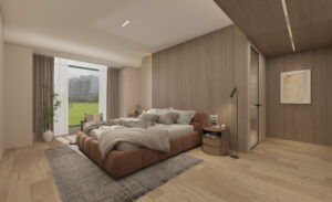 The ceiling directly above the entrance of the master bedroom area adopts line lights, which can avoid the projection of backlighting during night reading and meet the overall aesthetics of the space while ensuring functionality. The walls of the master bedroom are decorated with beige art paint, interspersed with traditional Chinese rattan materials and weaving techniques for cabinet door design, allowing a subtle Zen flavor to spread in the master bedroom, both antique and fashionable.