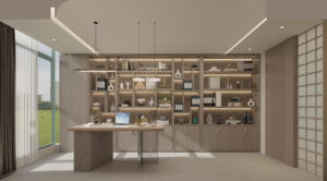 The study area aims to fully utilize the spatial layout, using LED line lights combined with point light source tube lights and decorative pendant lights to light up this second space in the home, making the space brighter, more spacious, and achieving higher utilization. The bookshelf section is designed with personalized irregular partition patterns, not only to create suitable space for the owner, but also to consider a more permanent aesthetic, which will be praised both now and in the future.