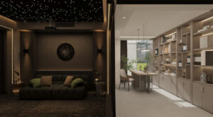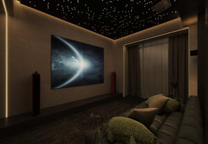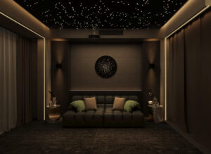 The roof of the audiovisual room area adopts a starry sky roof design, with black and white tones that exude a sense of cosmic starry sky. A circle of light strips are also created around it for supplementary lighting, making this sci-fi feeling even stronger.