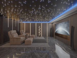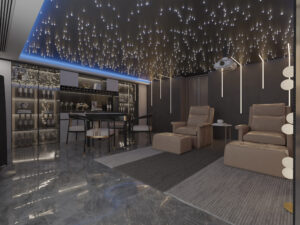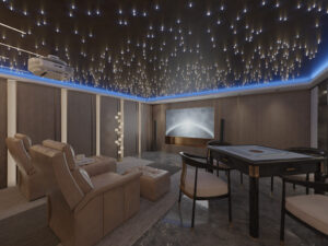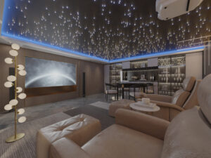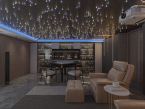 The ceiling part directly above the audio-visual room adopts the starry sky top design with line lights and lamp beads, and with the blue light design of the lamp belt, it meets the aesthetics of the whole space on the premise of ensuring functionality, and you can enjoy the ultimate feeling of watching movies without leaving home.