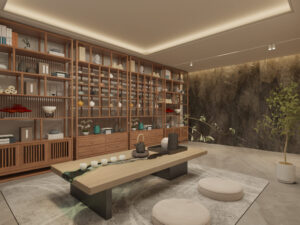 The design of the tea room integrates modern and Chinese traditional style to create a stable and classical atmosphere with solid wood furniture and dark tone colors.