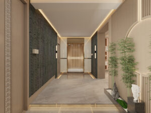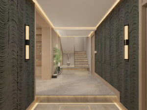 The corridor refines Chinese traditional elements to create a romantic atmosphere of Oriental aesthetics.