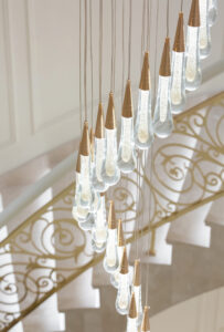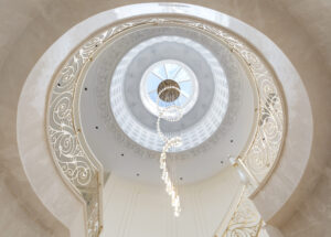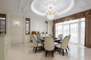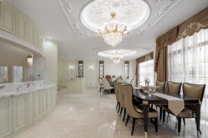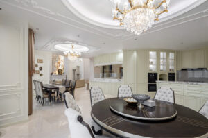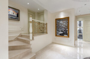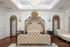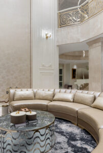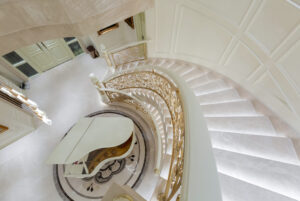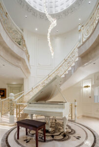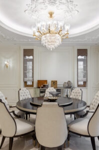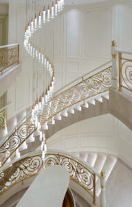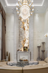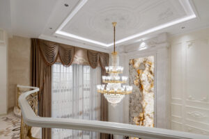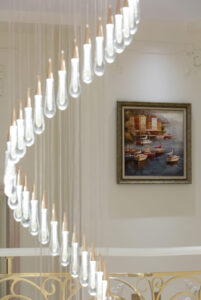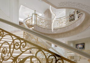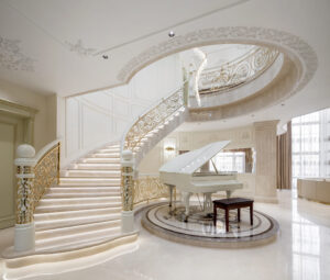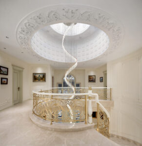 通过灯光的朦胧效果、精致的家具以及经典的装饰风格,每个细节都传递出尊贵与优雅。简洁的单杆旋转楼梯扶手吸引着年轻人的眼球,提供了无限的想象空间;而更为稳重的手扶栏杆款式则适合家庭使用,兼顾了安全与美观。 客厅的挑高设计成为无法忽视的亮点,巨型水晶吊灯、精美墙面和豪华家具共同构成了一幅震撼人心的视觉盛宴,彰显出空间的广阔与气派。复式结构强化了这种宏大的艺术表现力。