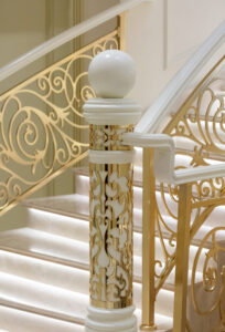 走廊的墙面及顶面采用较多线条的设计,引导观看者把视觉点规整为有次序的视觉元素,通过规整的线条,使空间更干净大方、利利落落;整体色彩以米、灰两色为主,搭配白色、金色等,简单的配色带动视觉变化、使整个空间更加有生命力。