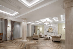 现代的轻豪华装饰风格,上面的装饰将更简单的现代元素与古典元素的氛围结合在一起。无论是在软装硬装的布局设计中,还是在色彩图案的使用中,都能体现出这一特点。现代风格硬装配合柔和的古典风格家具,整体的感觉时尚且豪华。