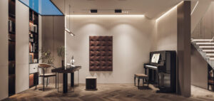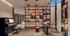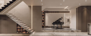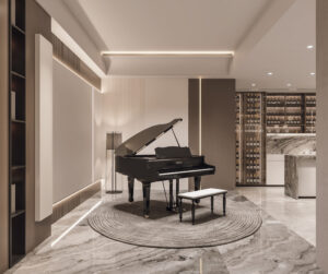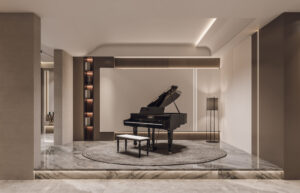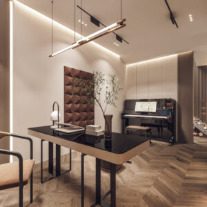 The study room, illuminated by the skylight, appears bright and expansive, while the private piano teaching area is designed with comfortable lighting and privacy in mind.